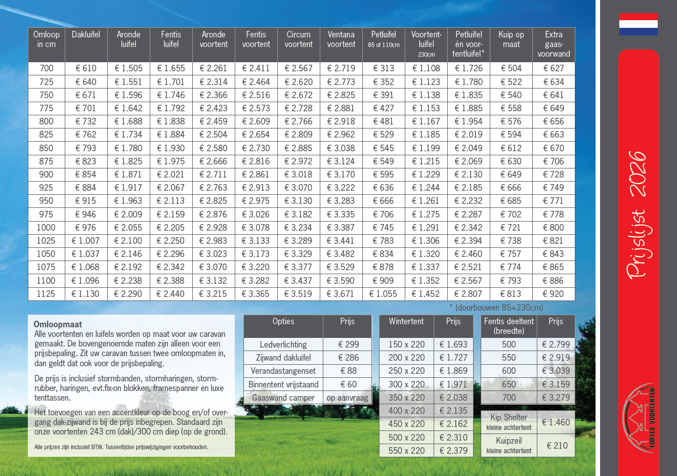 Wij van Fortex Voortenten heten u van harte welkom op onze website. Wij zijn gespecialiseerd in het maken van voortenten en luifels op maat en naar wens van de klant. Dit betekent een voortent of luifel met de perfecte pasvorm bij de omloopmaat van uw caravan, een kleurcombinatie zoals u deze wilt hebben, een voortent of luifel met de door u gekozen extra opties. Onze voortenten worden gemaakt in een ronde vorm met boogstokconstructie, hierdoor hebben ze unieke eigenschappen wat betreft stormvastheid, waterafloop en uitstraling.